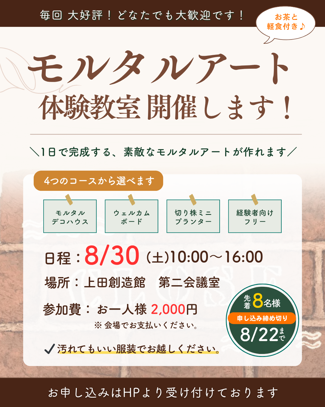 モルタルや水性塗料を使用しますので汚れてもいい服装でお越しください。